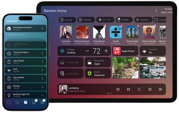 X4 brings a clean, modern refresh to your Control4 touchscreens, remotes, and mobile apps. The home screen now showcases your Favorites and active Media Sessions right up front, with a Quick Actions bar at the top for fast access to your most-used commands, like lighting, motorized shades, or music.